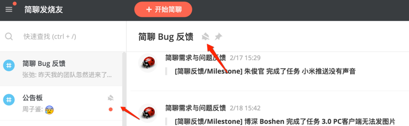 简聊可以将指定对话的消息提醒暂时关闭,点击聊天标题栏上的「铃铛」按钮,即可关闭消息提醒,此时有新消息时将没有提醒,通知栏只显示一个红点,不再显示消息数,再次点击按钮可恢复提醒。