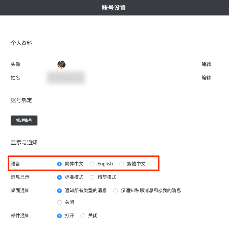 简聊web版当前支持简体中文,繁体中文和英语3种语言选项,可以点击右上角用户头像 -> 选择「账号设置」 -> 选择希望设置的语言
